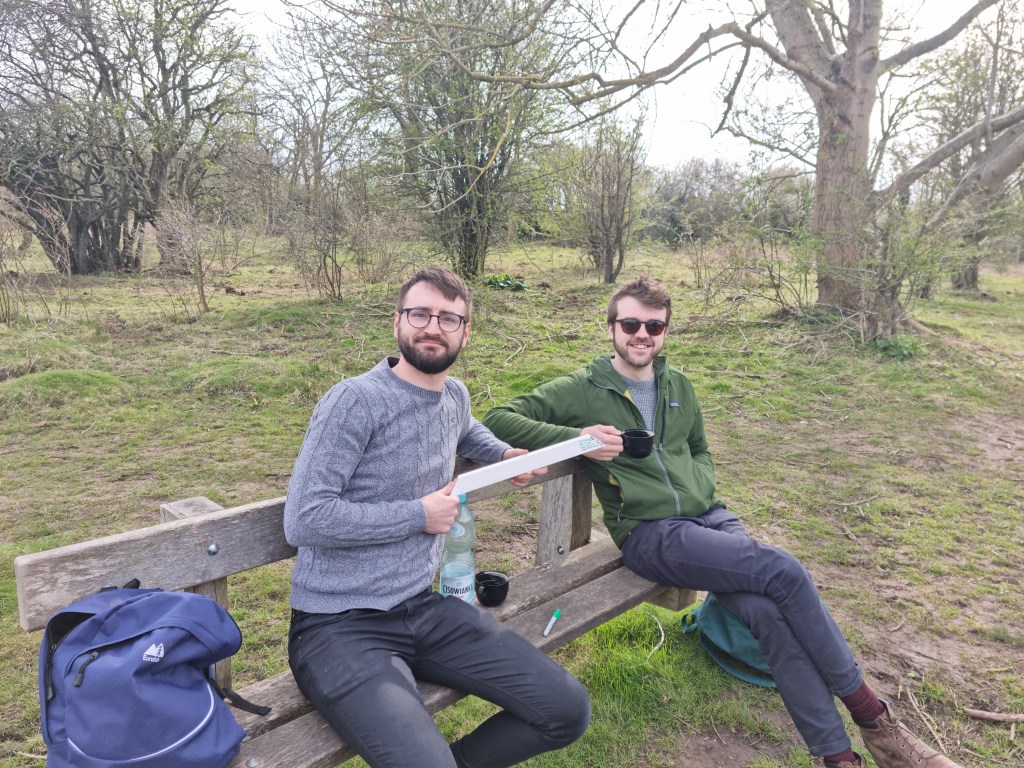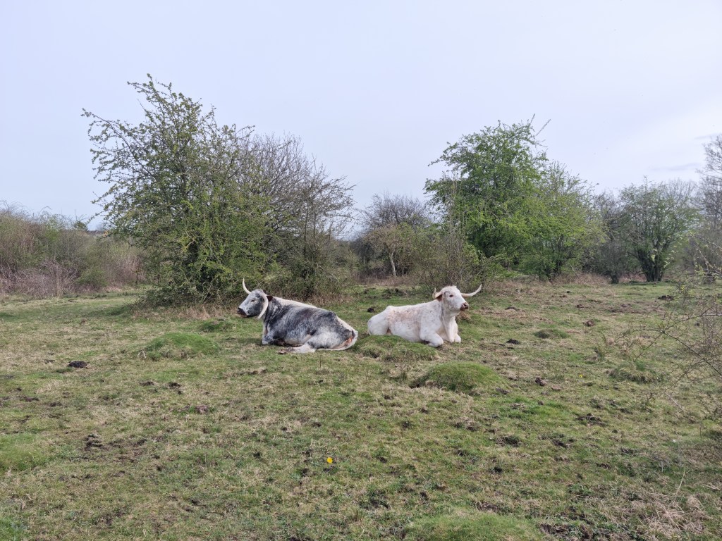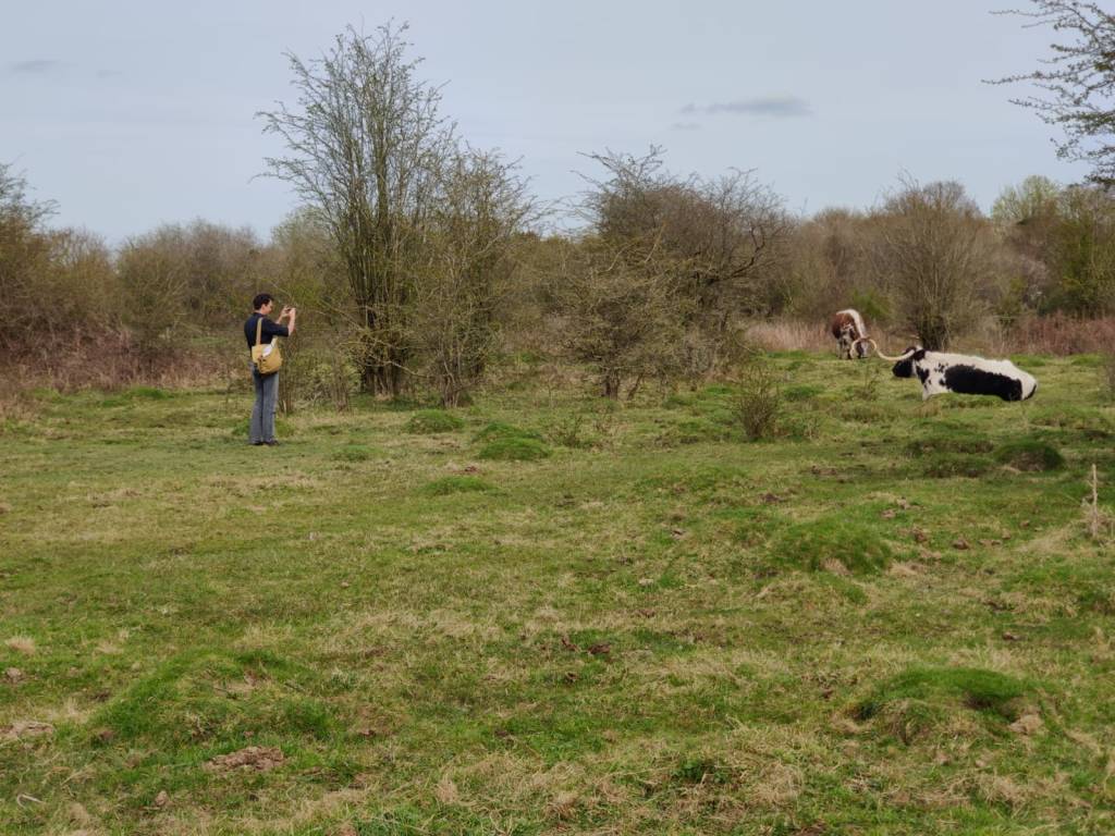 In the common I encountered Liam and Morgan. They were chilling, drinking flask coffee and birdwatching and cow watching. A kestrel was pointed out to me and Morgan noted that the nearby longhorn scratching himself against a tree branch had been at it for 20 minutes.
